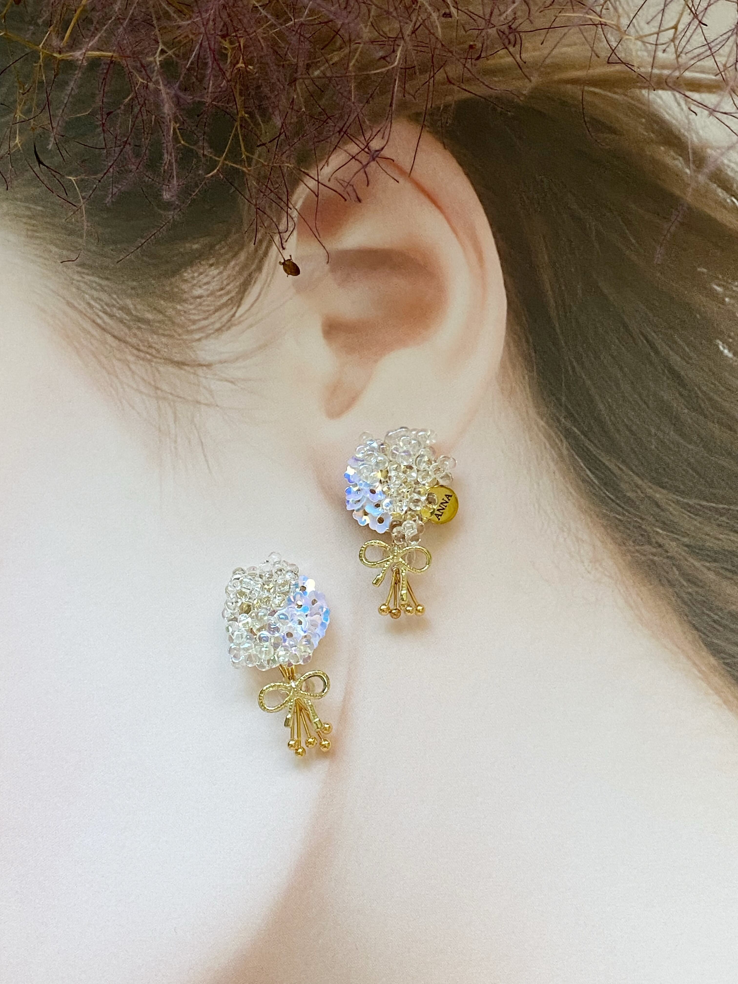 極小のお花型スパンコールとオーロラ・クリアのファルファーレビーズを使用した小さいながら豪華なアクセサリーです